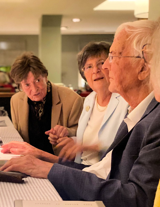 Im Kreuzverhör dreier Damen ©HL Schmerzlich vermissten wir Helmut, der sich die Mühen der langen Reise von München nach Hamburg nicht zutrauen mochte und Lotte, die von zwei Stürzen genesend nicht unter uns sein konnte.
