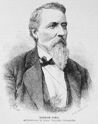 Friedrich Hecker was popular due to his open character, his winning charms, his decorative marketing with hat and blouse and his fiery temperament. Once he had decided on his Heckerzug he had shouted at the intellectuals debating a German National Assembly in Frankfurt full of public appeal: Stop threshing empty straw, rather join me! [Stru49].